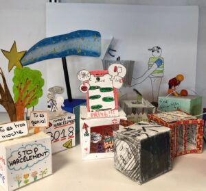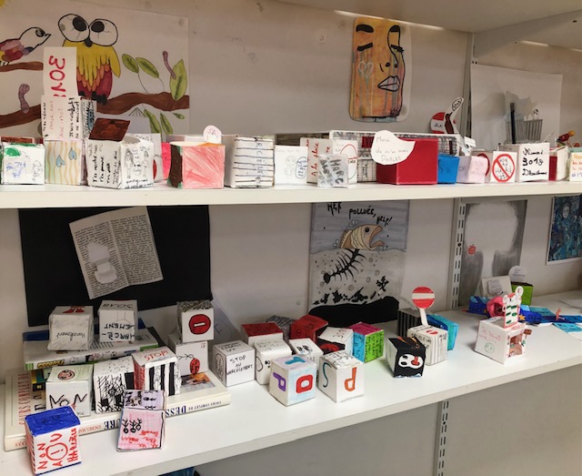 Tous les élèves de toutes les classes de 6e ont réalisé « un cube contre le harcèlement » ; plus d’une centaine de cubes ont ainsi envahi les étagères de la salle d’arts plastiques ; l’idée est de les rassembler en une seule oeuvre et de réfléchir ensemble à un projet collectif (ce projet n’était pas prévu, mais c’est toujours intéressant de créer de nouveaux projets, à partir des réalisations des élèves ) :
