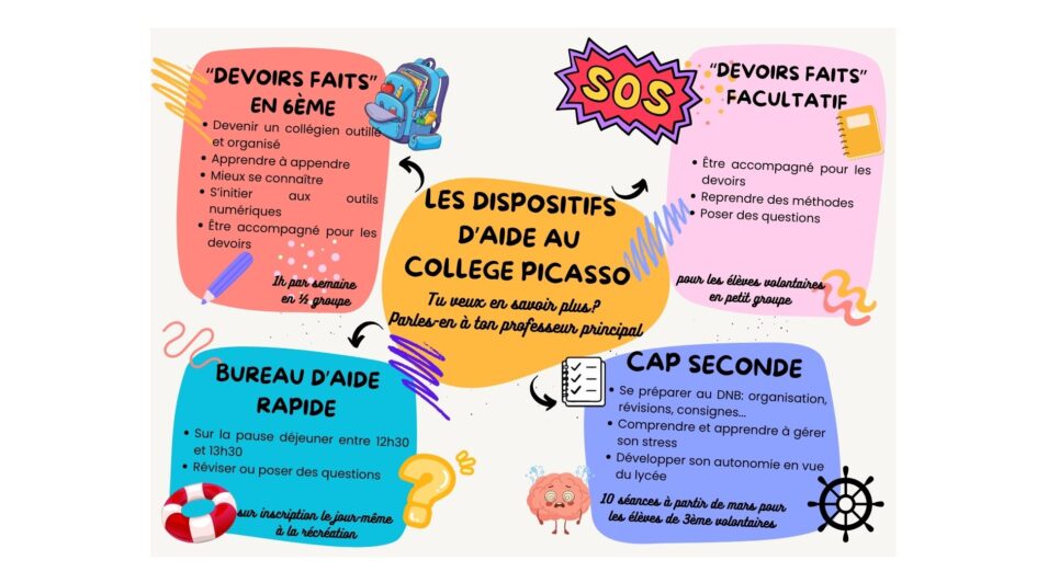 Voici un document qui récapitule les différents dispositifs d’aide, de soutien et d’accompagnement que nous proposons au Collège Pablo Picasso.